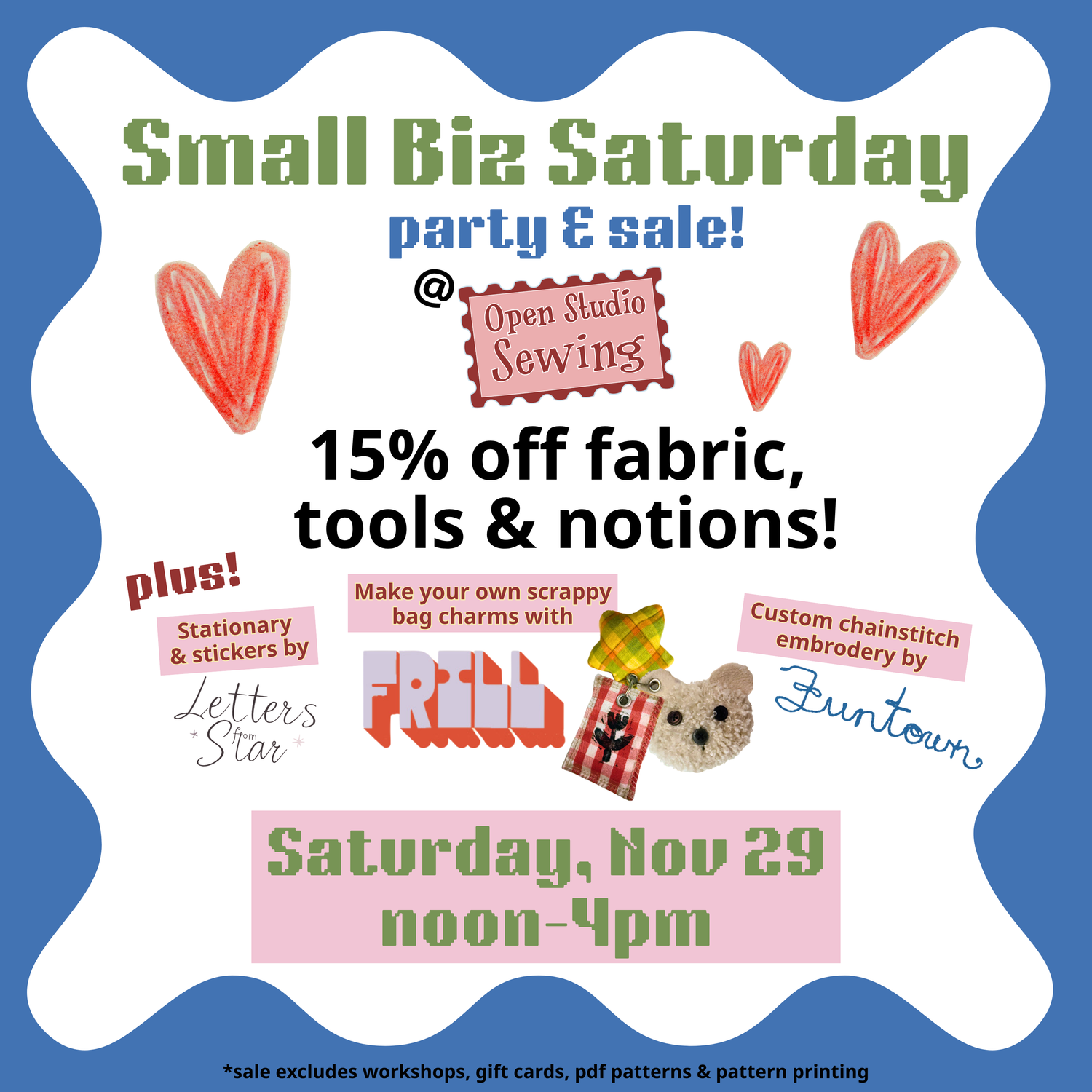 Come hang out with us! We're having a party (& SALE!) featuring vendors, treats, free craft activities, custom chainstitch embroidery, and more!! November 29, noon-4pm.