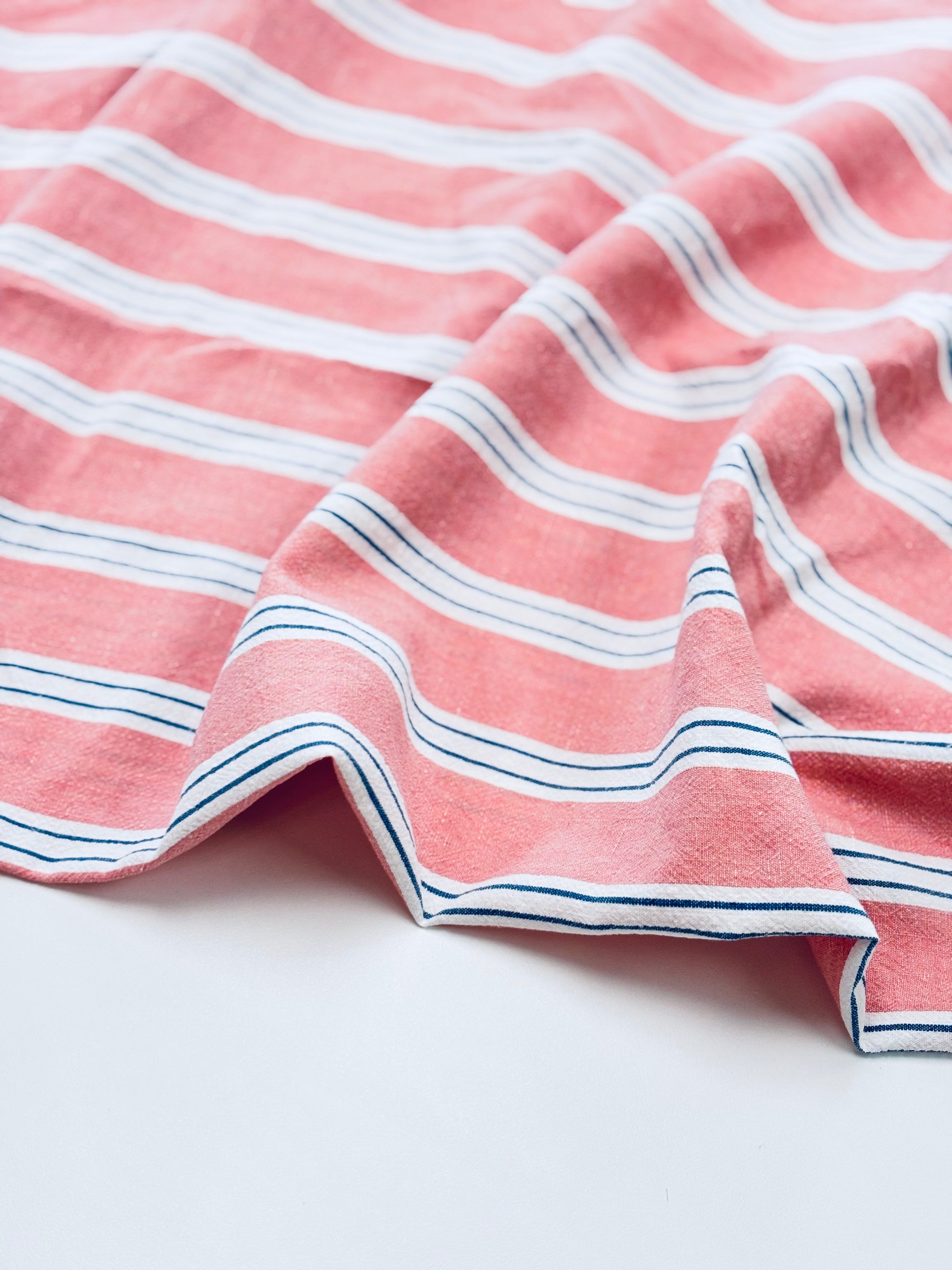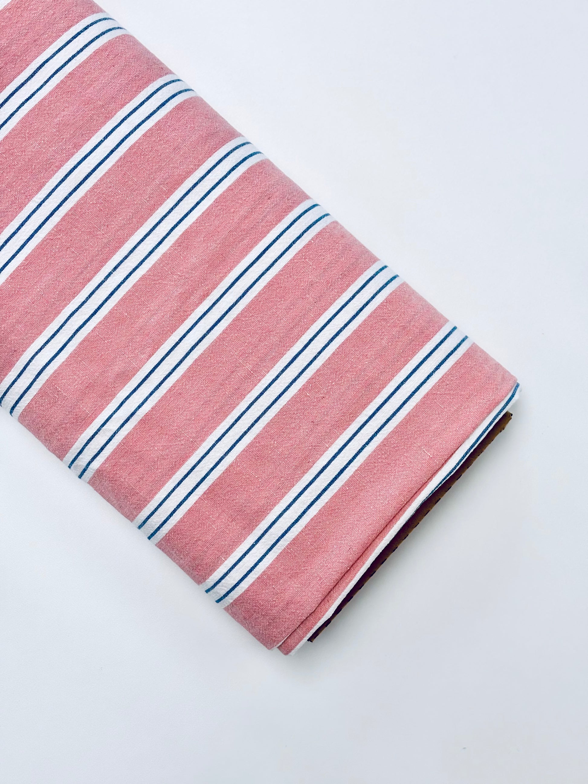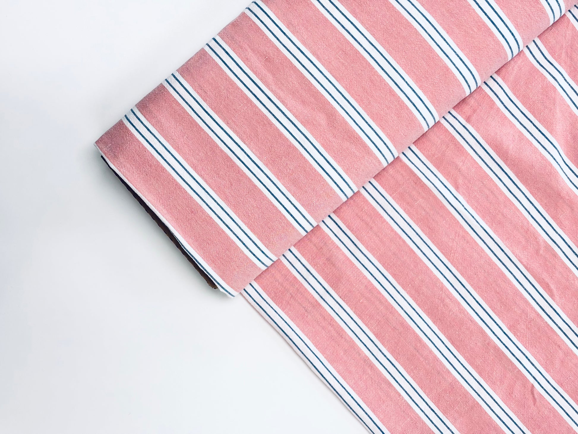 A beautiful yarn-dyed cotton/linen blend that reminds us of our favorite nostalgic Fruit Stripe gum. This fabric has some texture and would work well as a pair of drawstring pants or a maxi skirt. Comes in green, pink, and blue. Stripes measure about 7/8" wide