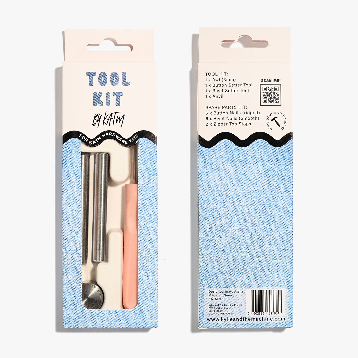 The KATM Hardware Tool Kit contains the tools required (BYO hammer) to complete your dream denim project! Designed to work alongside all of our Hardware Kits.