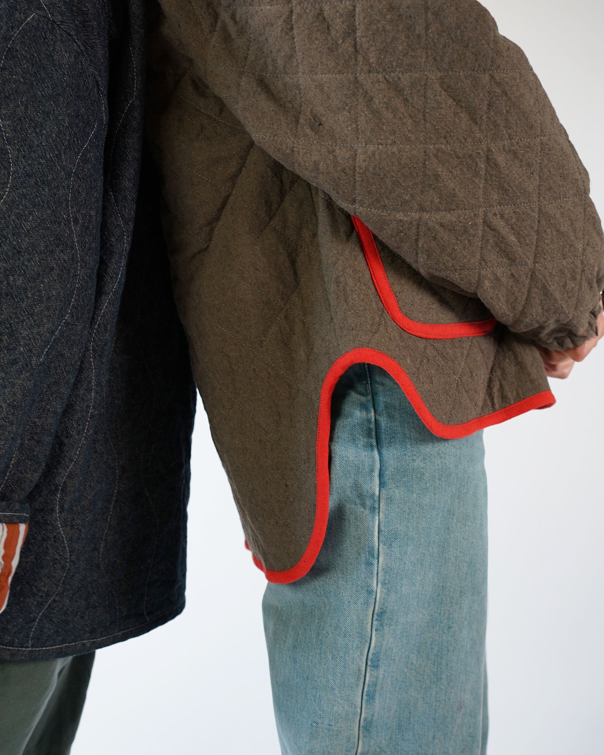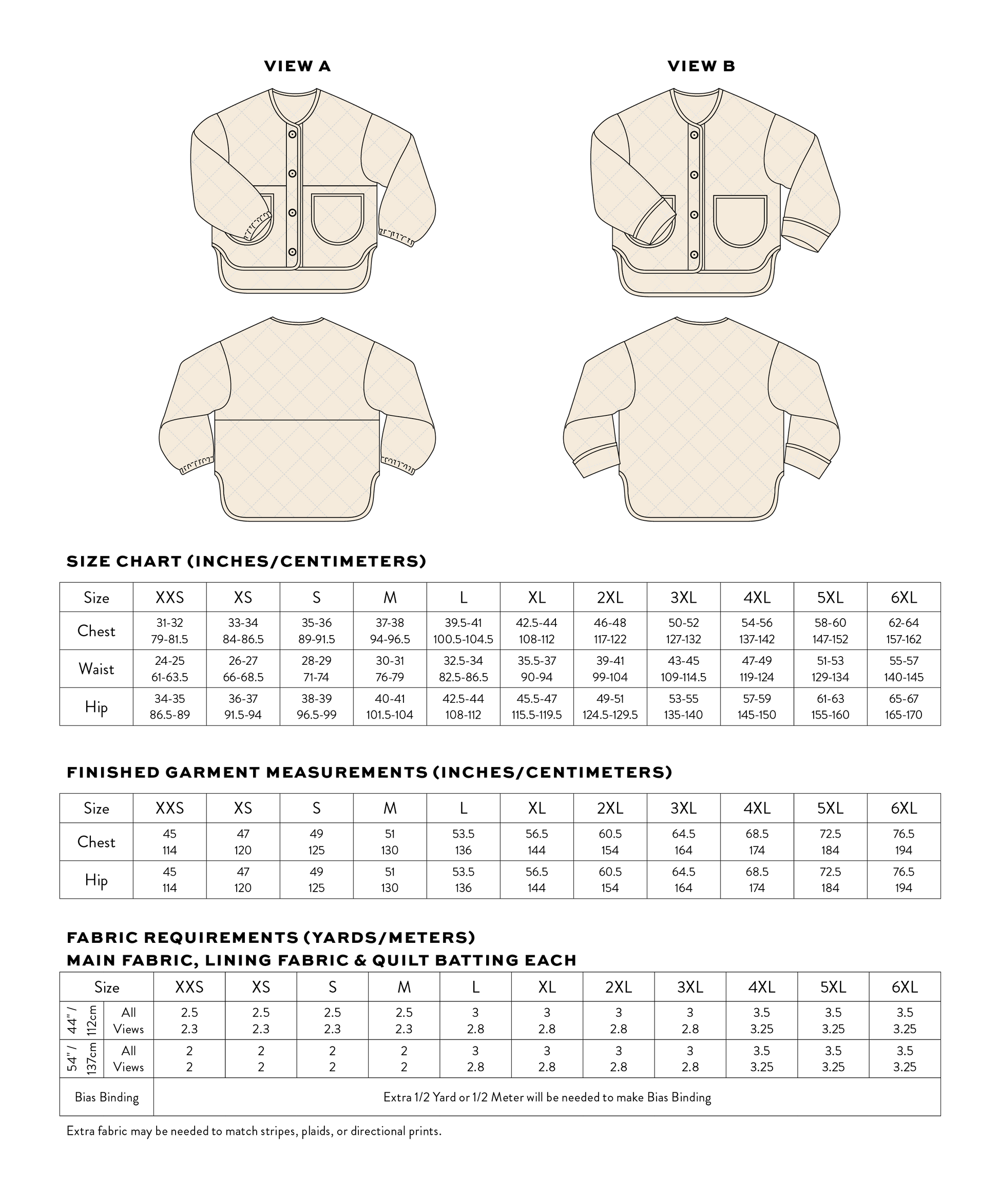 The Homebody Quilted Jacket is designed to be a cozy oversized piece you can throw on for comfort and slouchy style points. It is a collarless jacket with a boxy fit, button placket and two front patch pockets. The sleeves feature a boxy style dropped shoulder, are roomy enough to fit a mid-weight sweater, hit below the wrist and finished with an elastic channel at the cuff to keep drafts at bay. Optional bias bound cuff is also available. View A is constructed by piecing together quilted sections to create visual interest with seams at the middle. View B is constructed with seamless pattern pieces for a traditional quilted jacket feel. No quilting experience is needed, you will learn the skills to create an heirloom quality jacket.