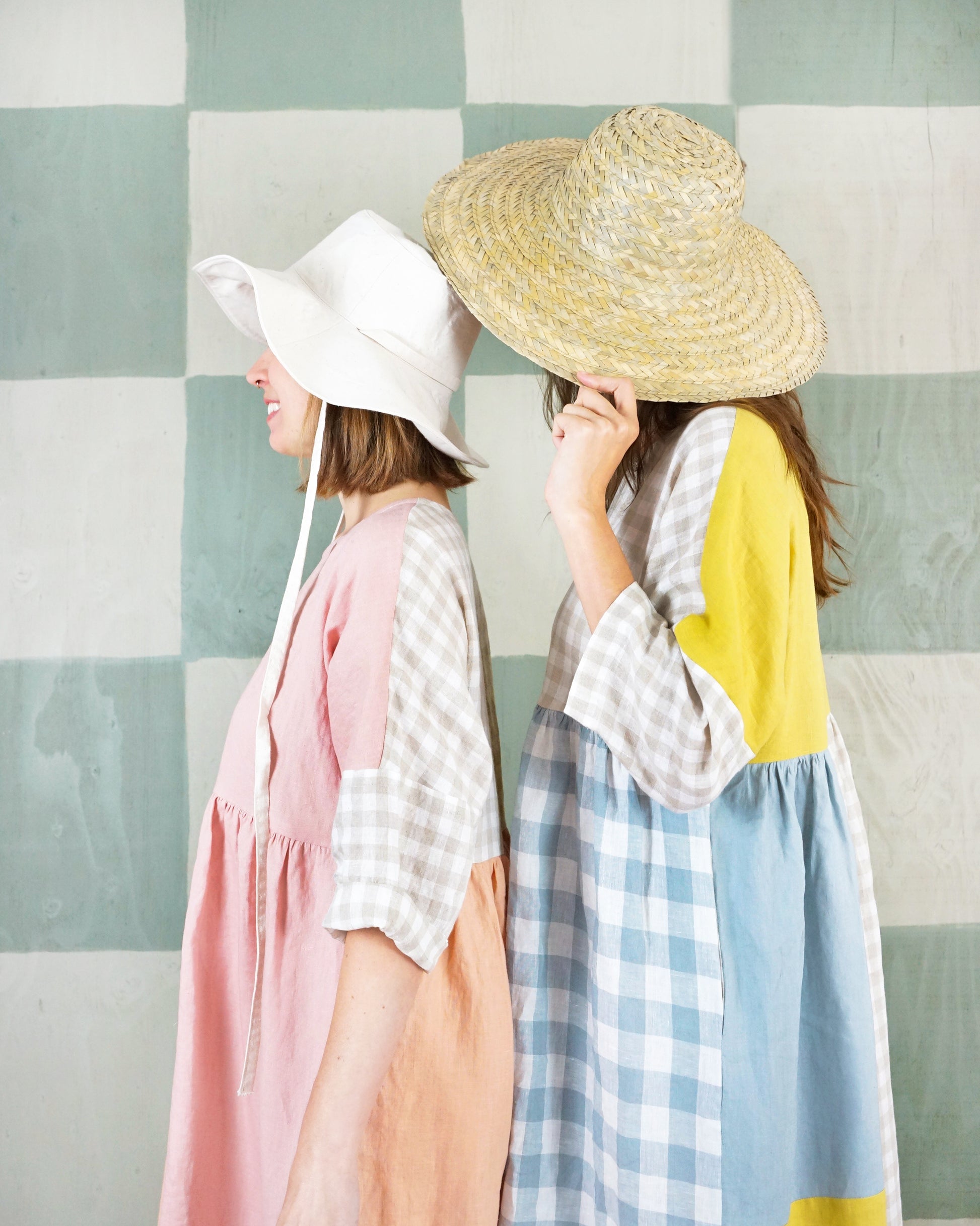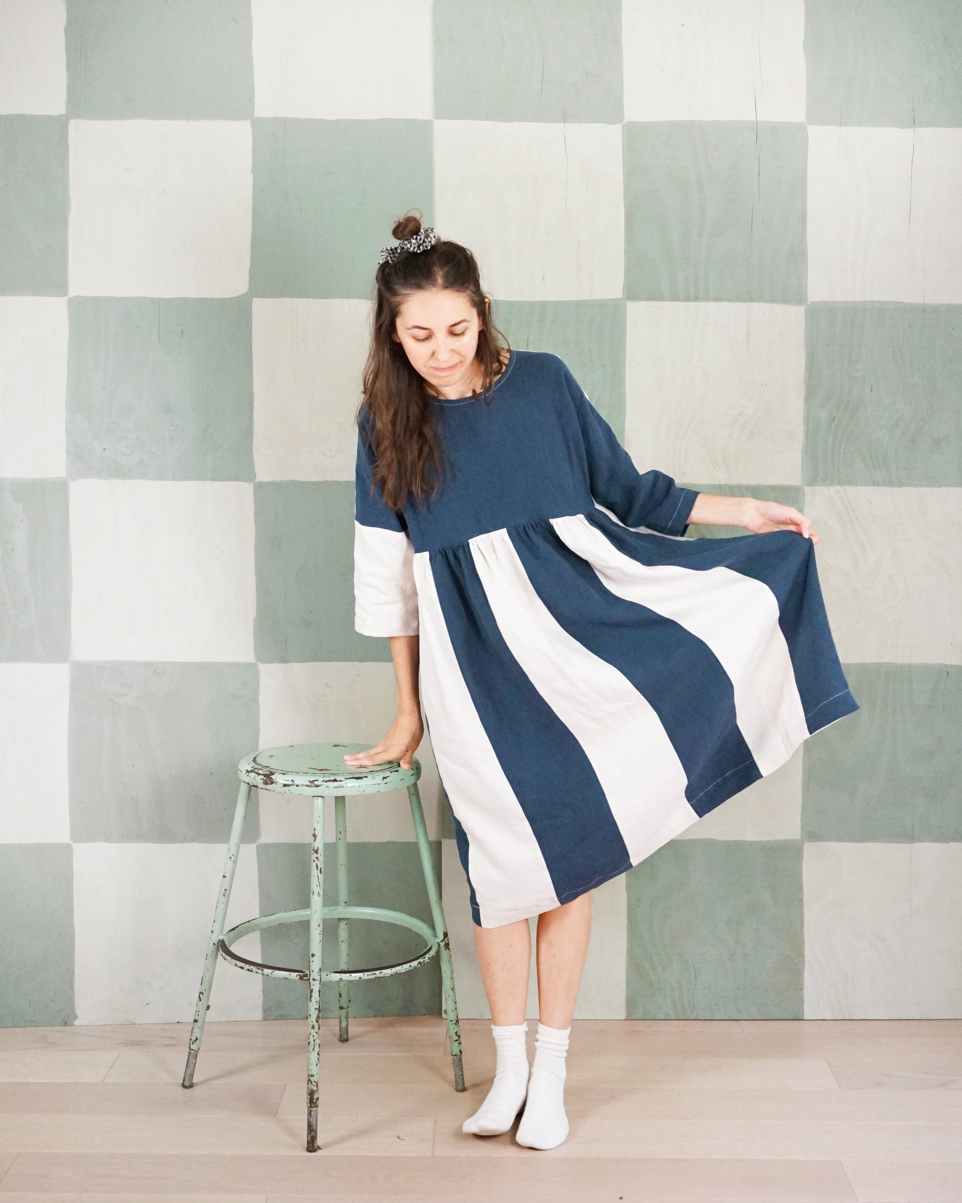 The Horizon Day Dress is a casual, easy fitting dress. It features a relaxed style drop shoulder with 3/4 length sleeves which can be worn down or cuffed. The curved bodice sits above the natural waistline, adding interest and shape to the oversized silhouette for a flattering drape. The pattern features two views, both with inseam pockets and adjustable skirt lengths marked directly on the pattern — from above the knee to mid shin. View A has a full skirt while view B includes a fun patchwork style skirt. This pattern is intentionally designed with simple shapes, making it a fast and fun project to sew.