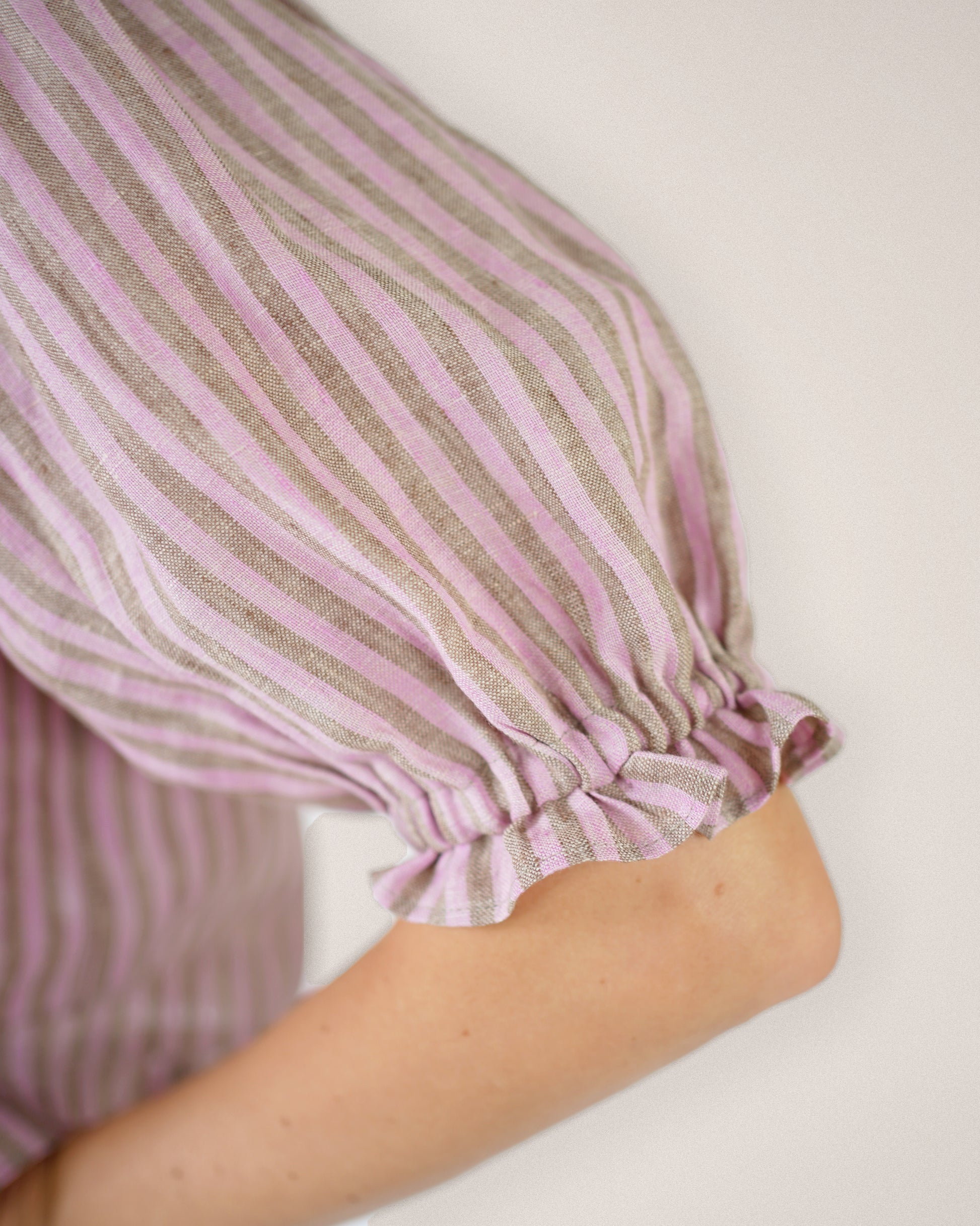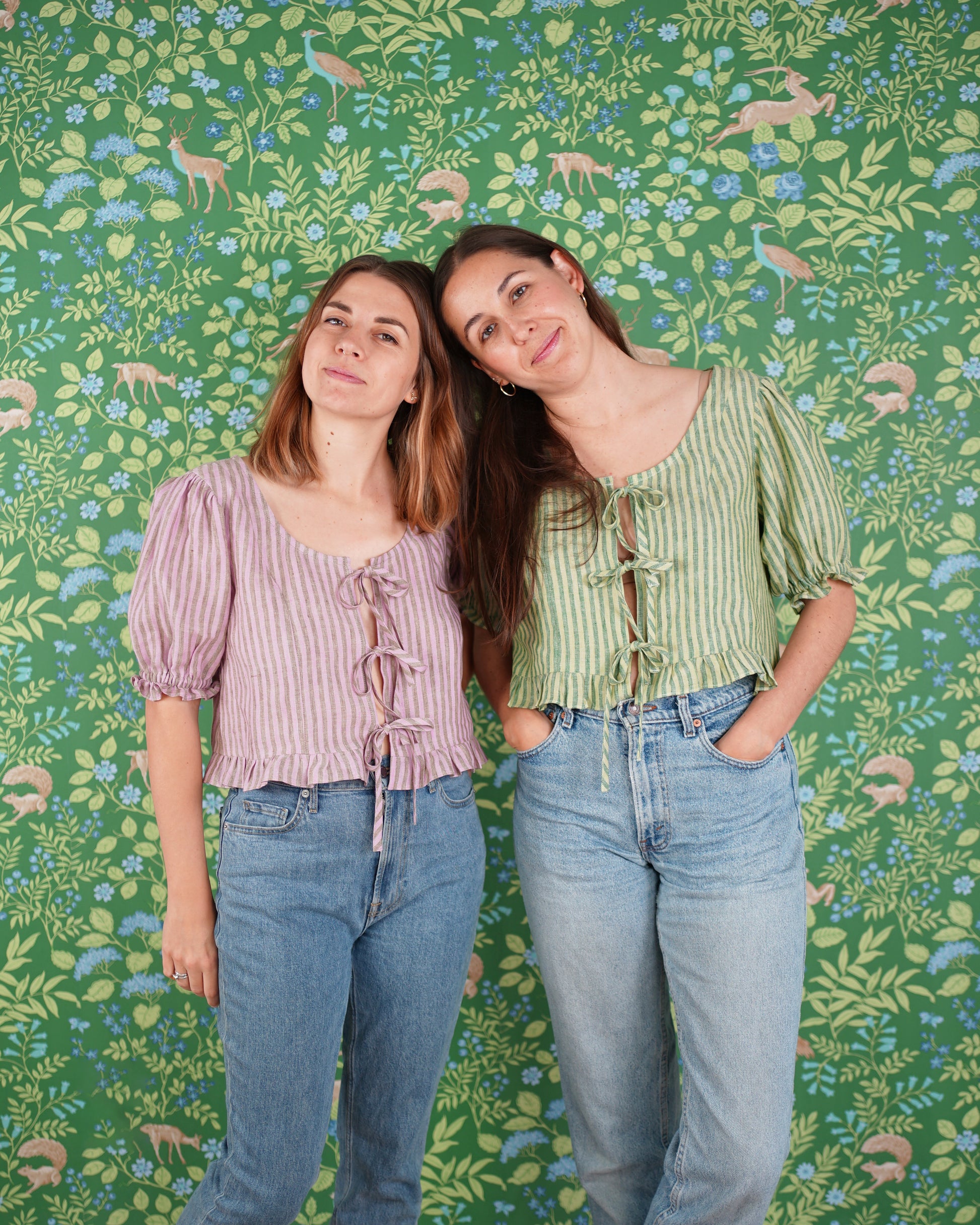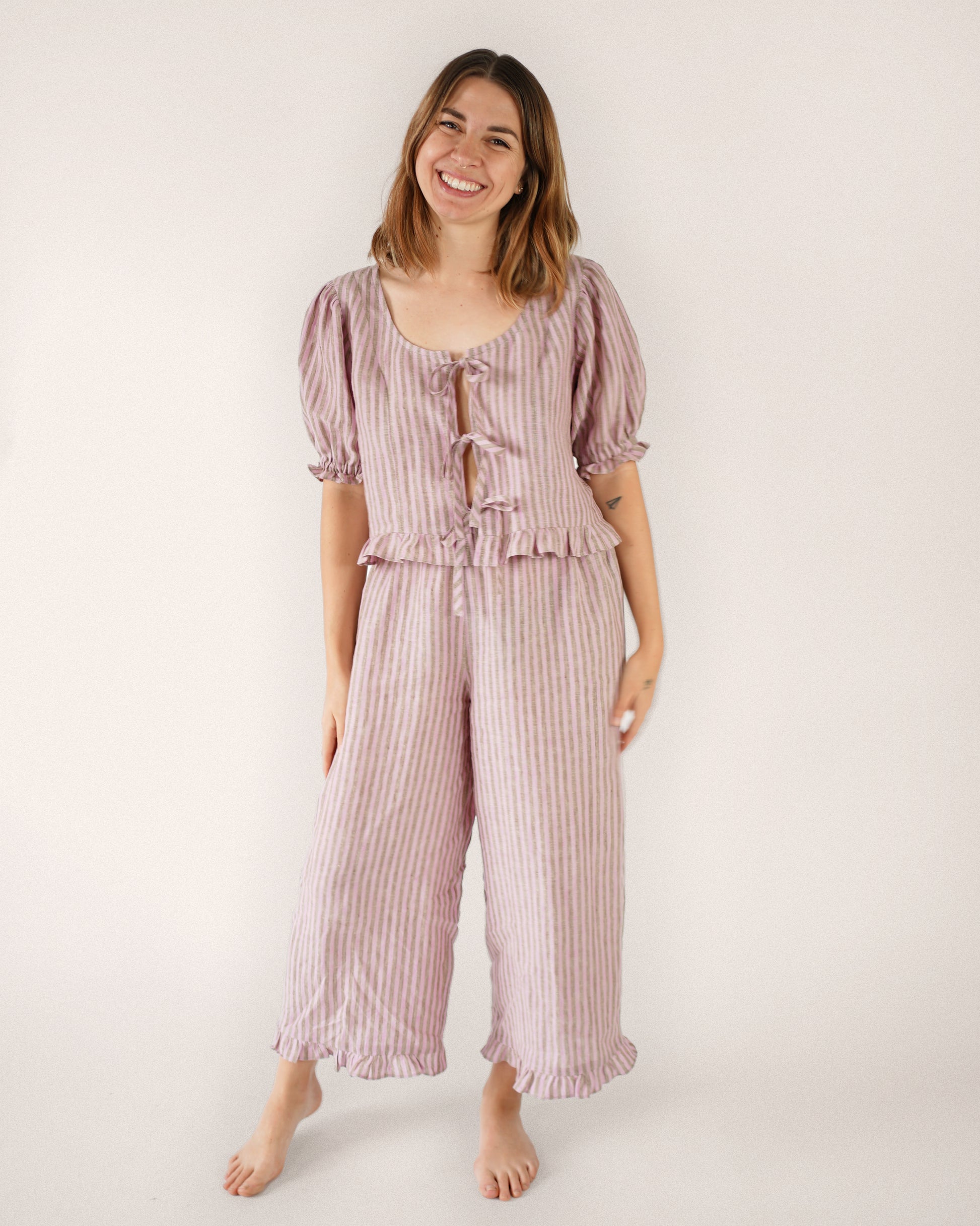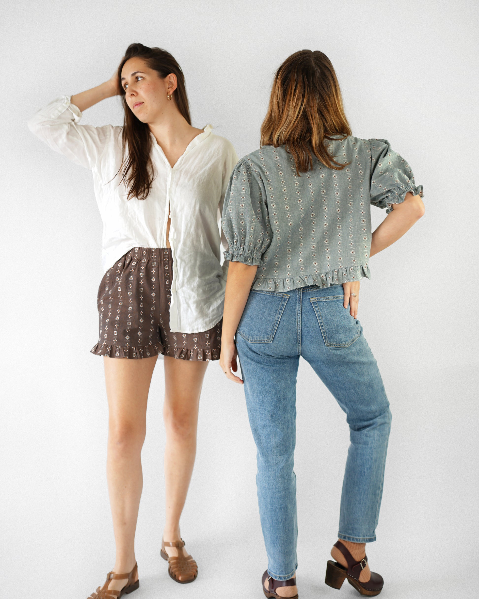 The Ruffle Brunch Set is a fresh and playful top and bottom duo that can be worn as a full outfit or fun separates. Designed with comfort in mind, the top features a wide scooped neckline, princess seams, and ruffles at the hems. The lightly puffed sleeves are finished with elastic and hit above the elbow. The top is slightly cropped and secured with simple ties up the front. The bottoms can be sewn as cropped pants or shorts and have a simple elastic waist, inseam pockets and matching ruffles at the hem. We love this set for pajamas, lounge-wear or elevated with accessories for a fun outfit.