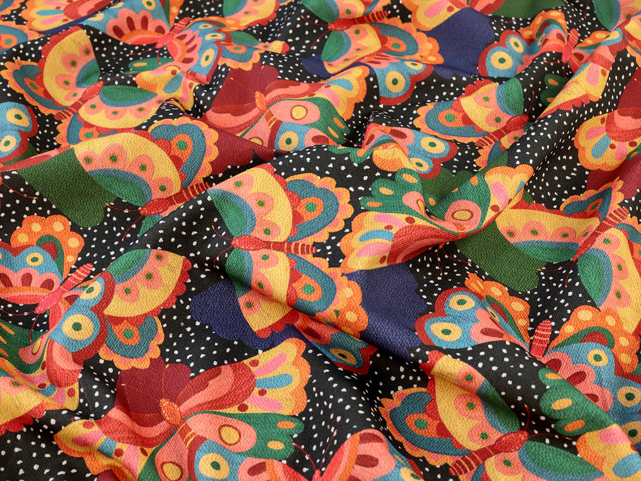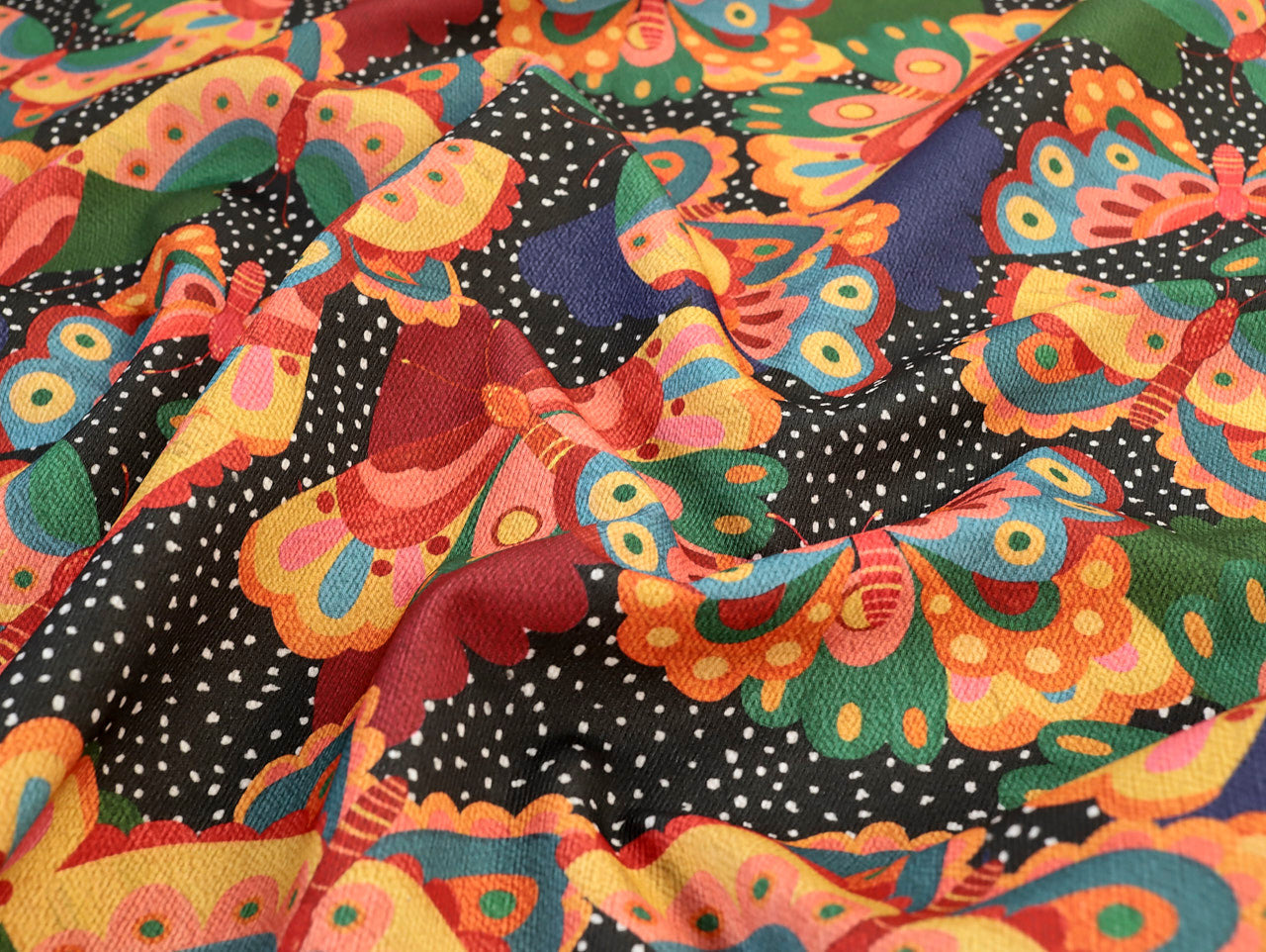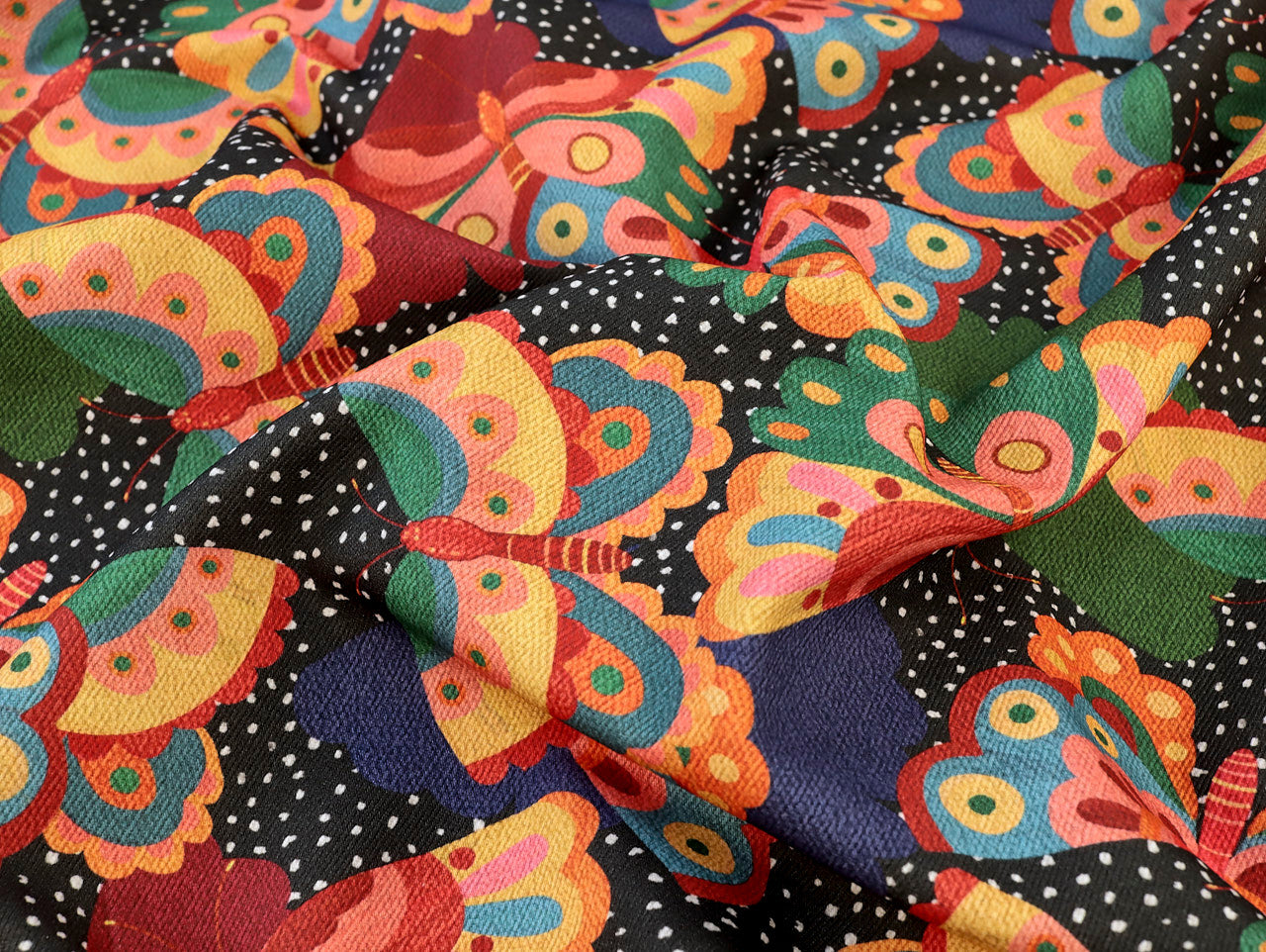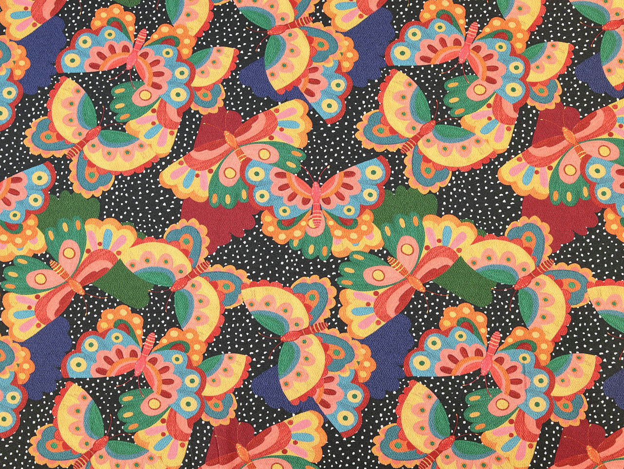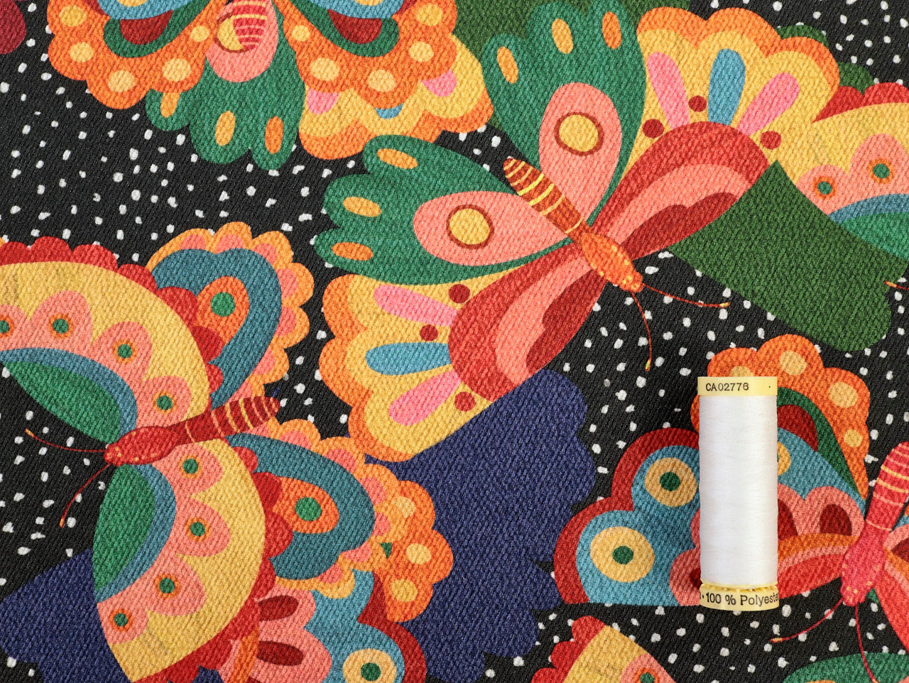 Bright butterflies flutter across a fabulous polka dot backdrop printed onto the most wonderful quality denim dressmaking fabric