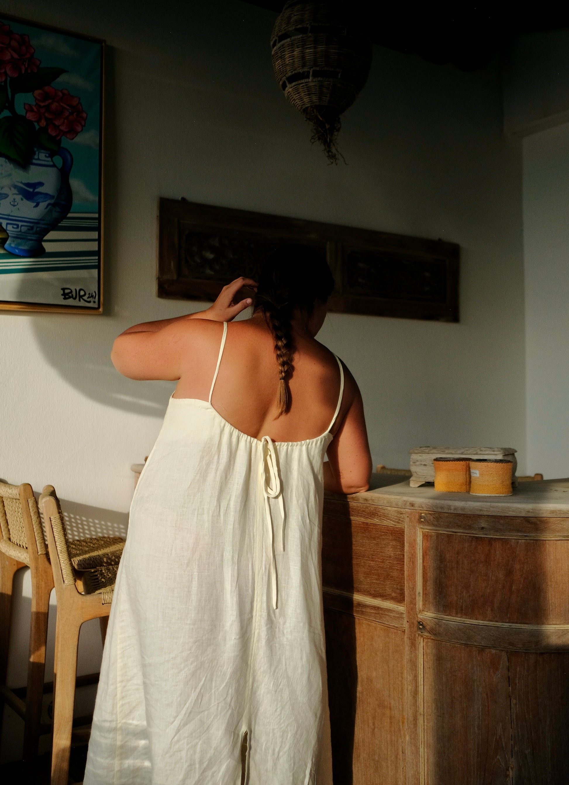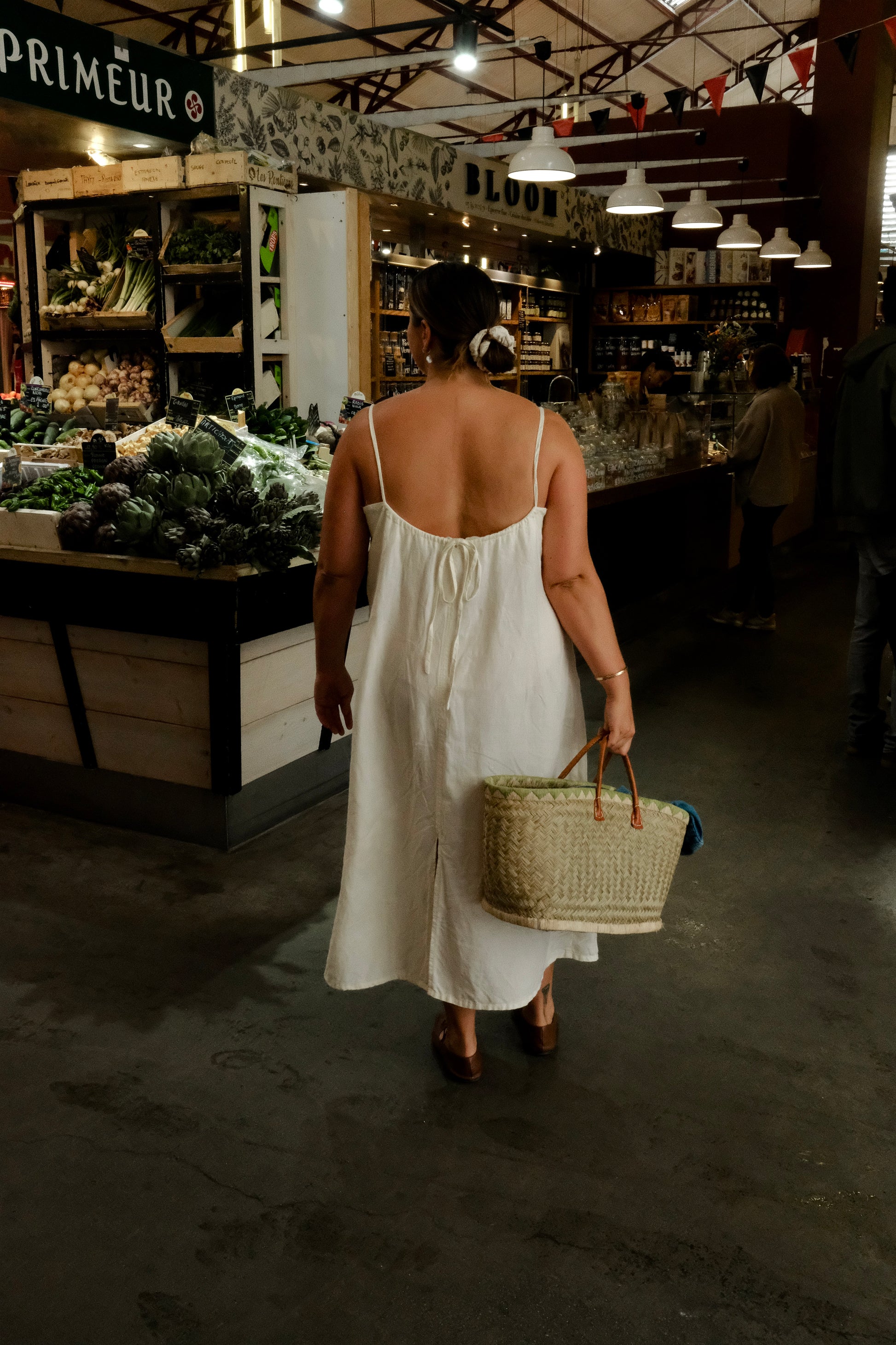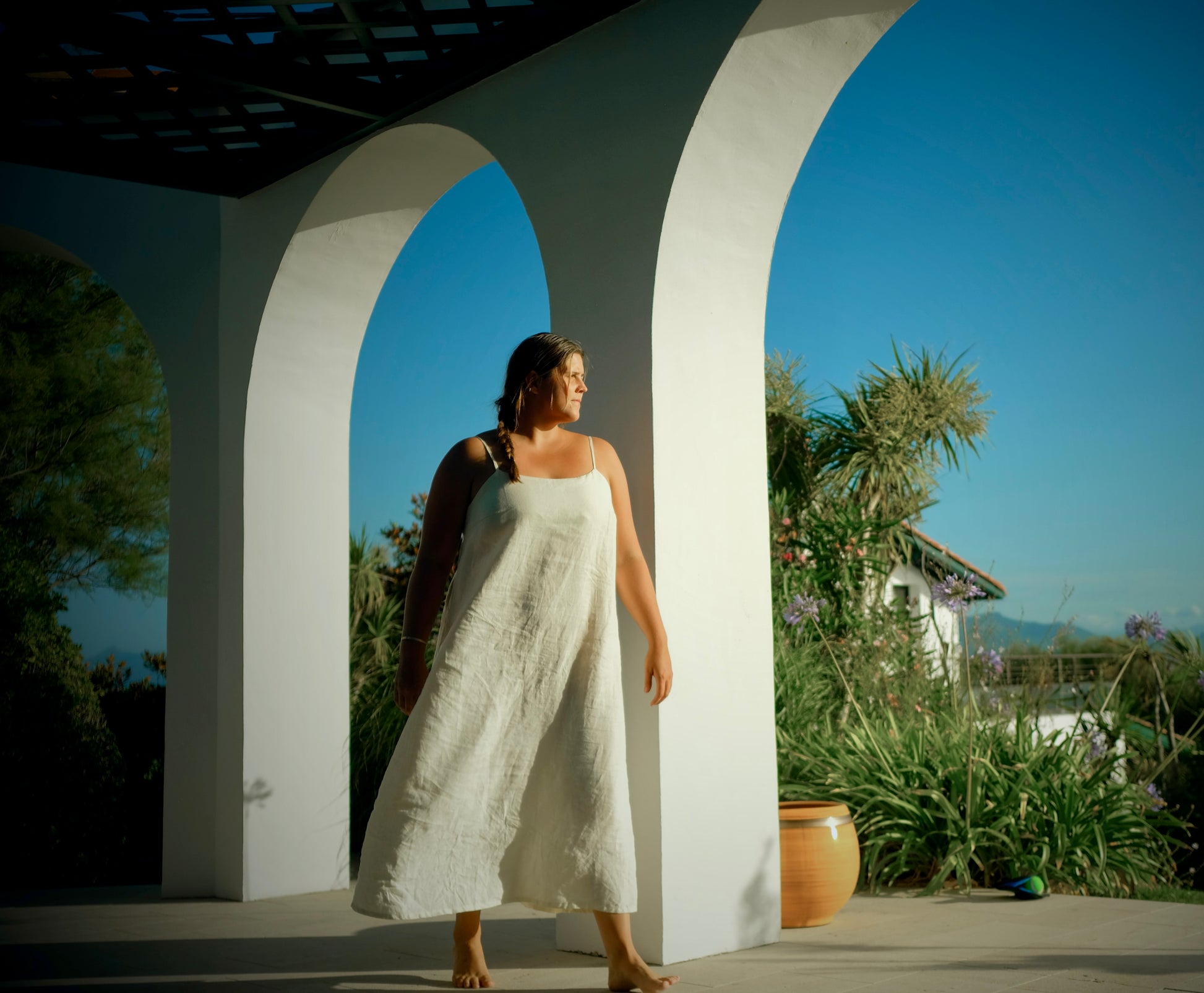 This pattern is made for woven fabrics and the look of it will change a lot depending on the fabric you choose. A crepe will make it date night ready, whereas a linen or cotton will make it the perfect everyday summer dress. Other favorites include seersucker for ultimate coolness, cotton poplin for a crisp and billowy silhouette, or any rayon/tencel for a beautiful drape. If choosing a thicker fabric, like linen, you may want to use a matching, lighter weight fabric for the facing/bralette.