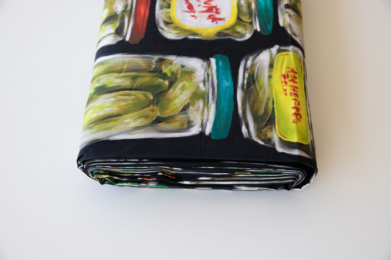 A lightweight and flowy cotton lawn covered in different styles of pickle jars!