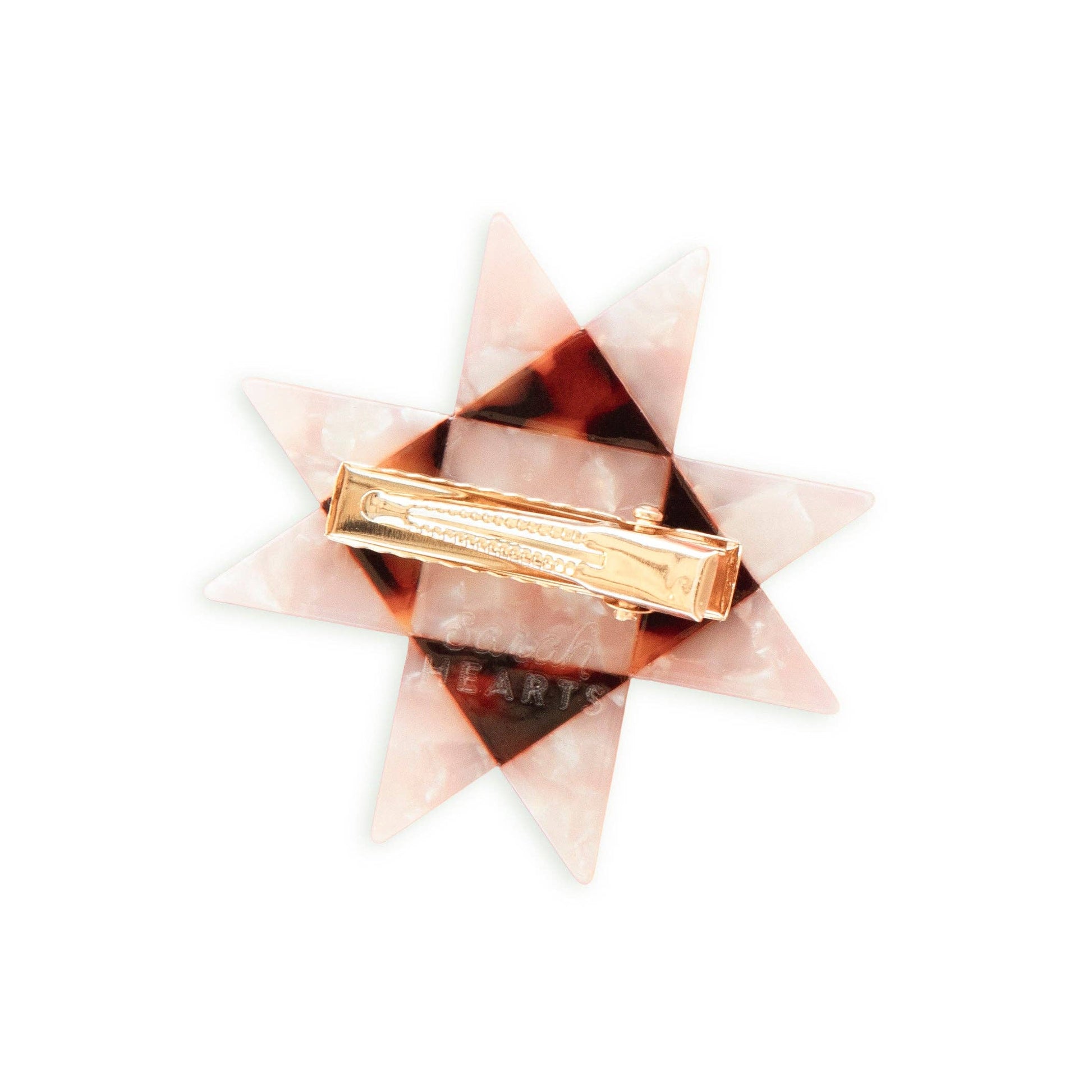 Our customer favorite hair clip got a little update! Elevate your hair game with our Quilt Star Hair Clip. The classic sawtooth star design, paired with a modern twist of brown and blush pink tortoise shell, will add a touch of sophistication to any outfit. Made from plant-based acetate and featuring a cream screen-printed design, this petite alligator clip is both stylish and eco-friendly. Secured with a gold alligator clip, it's the perfect accessory for any sewist.