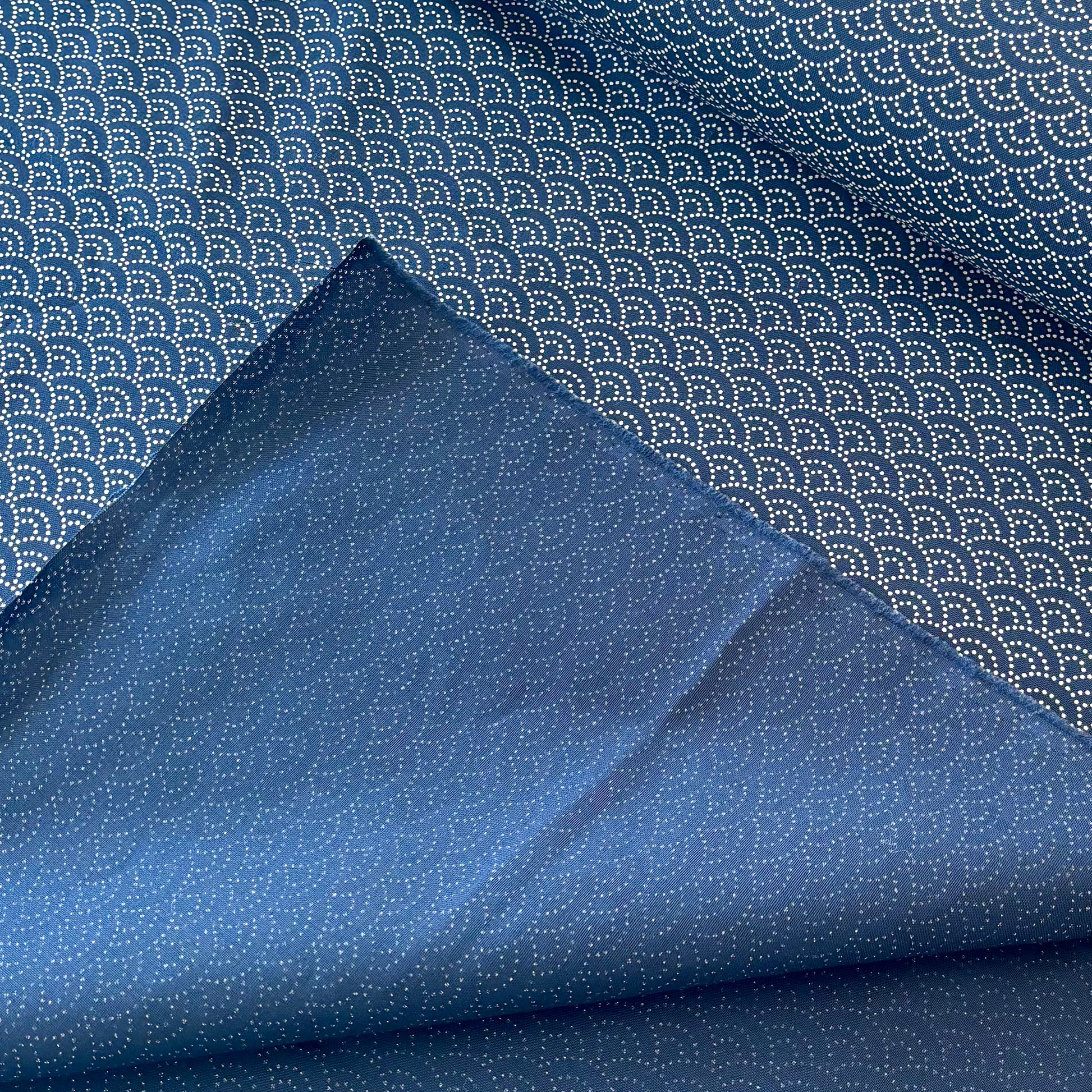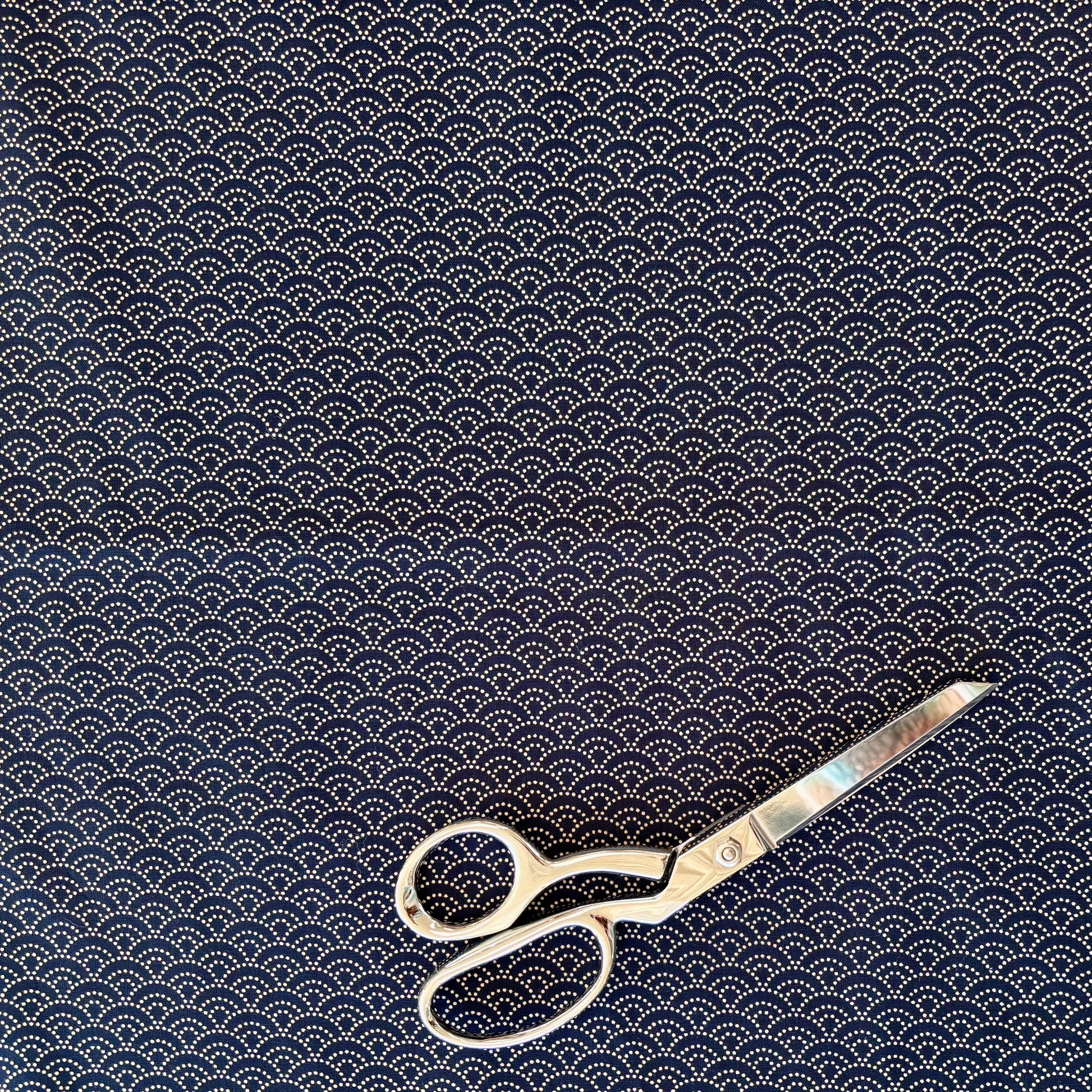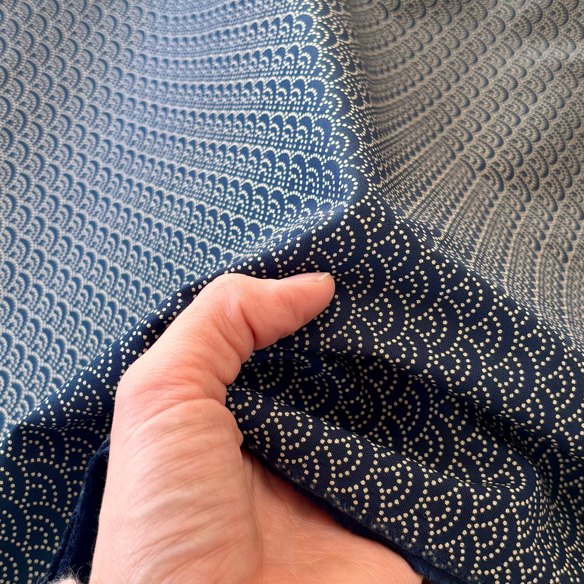 This fabric was sourced in Japan by my friend Elin! It's a crisp cotton, with a Japanese fan print on a dark blue background. I'd call this a cotton sheeting - suitable for lighter-weight garments where you still want some structure (like a button down, or something with pleats), and great for quilting. Please note that the back side of this fabric is not printed.
