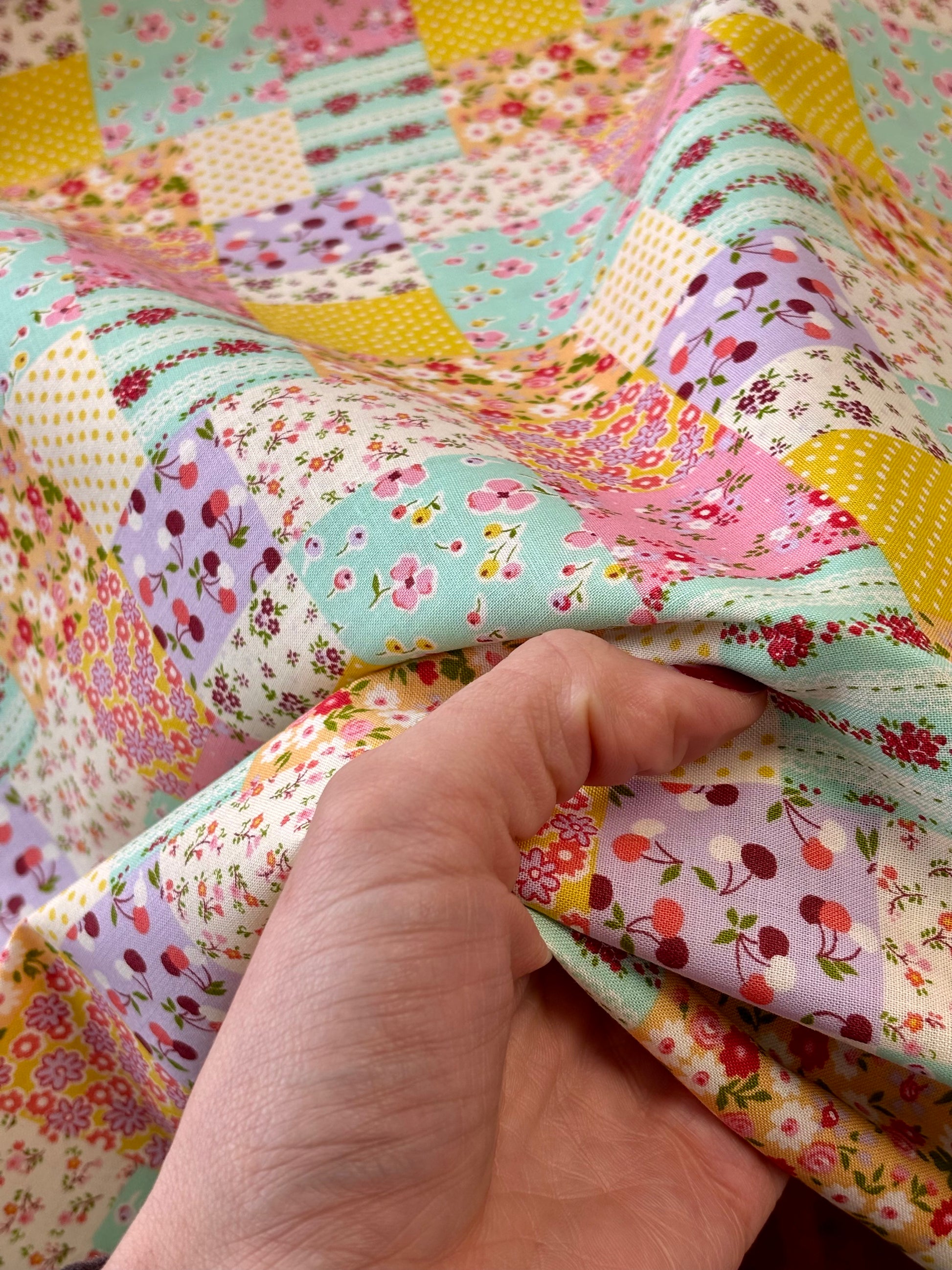 A pretty patchwork design printed on a light cotton fabric. This fabric is slightly crisp and would be suitable for both garments and quilting!