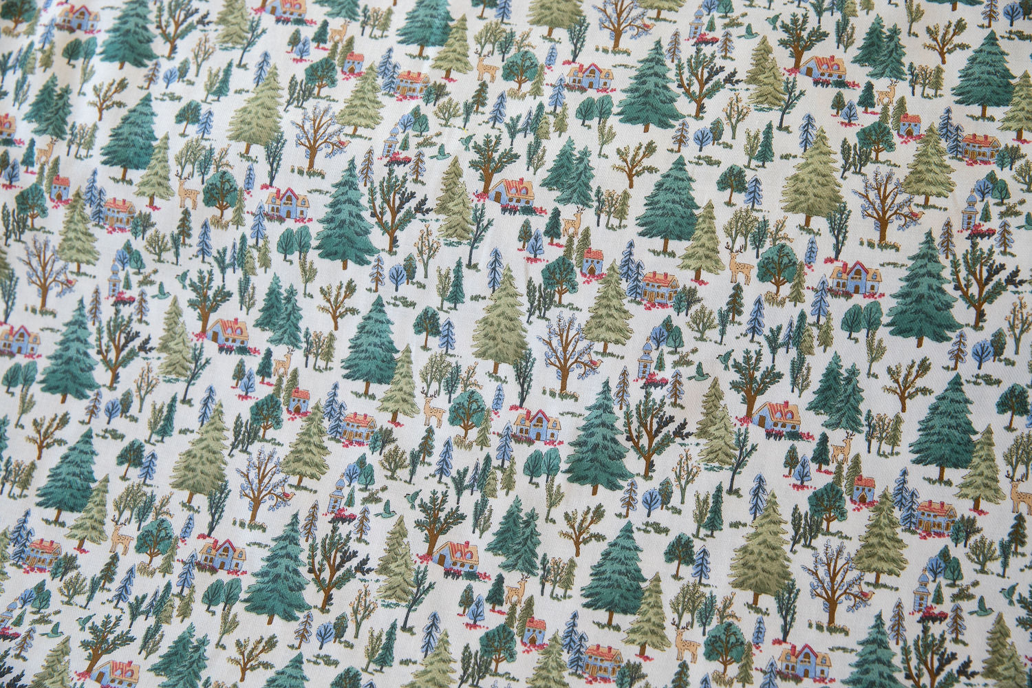 Viella is a lightweight cotton twill. This is a soft fabric with a super cute woodsy print, including trees, cottages and foxes printed on a creamy white background. A high-quality fabric manufactured by Japanese fabric company Hokkoh.